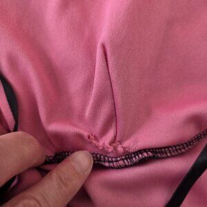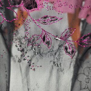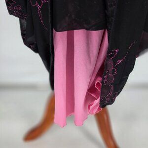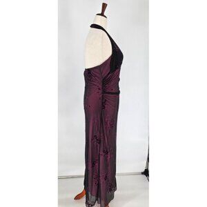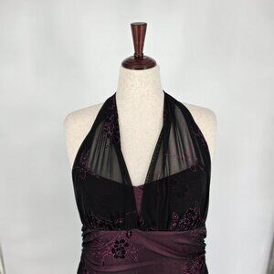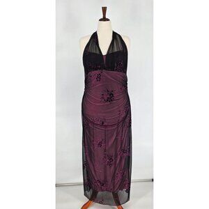 Vintage Y2K maxi dress. Black mesh with metallic/shiny floral details. Overlaid on pink lining. Halter neck with mesh bodice. Slightly stretchy material. Pullover.