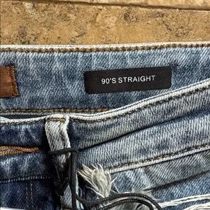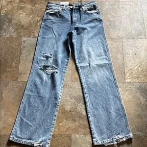 Trendy straight leg jeans with distressed details. Light blue wash. Comfortable fit. Measurements: Waist 13 1/2", Hip 16", Rise 10", Inseam 10 1/4", Length 39 1/2", Bottom Width 9". Any questions, please ask #611