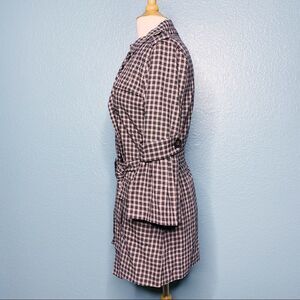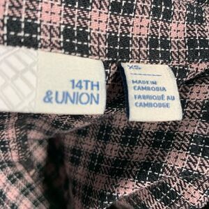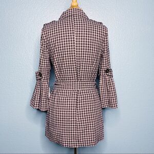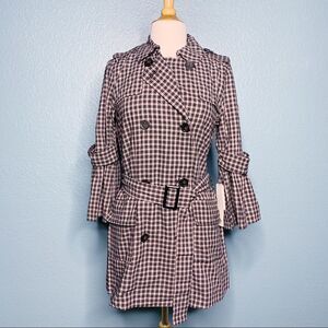 Super fun trench coat with a twist by 14th & Union New With Tags. Plaid print with pink and dark charcoal/black color. Two pockets. Belt. Sleeves have a bell cuff. Double Breasted. Tabs at Shoulders. Super cute! All measurements are approximate, taken flat and buttoned closed.