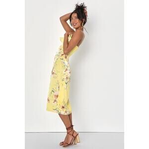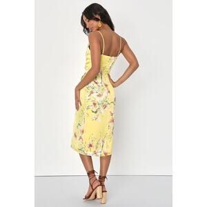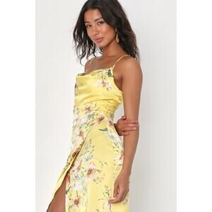 NWT Lulus Sunny Blossom Yellow Floral Print Satin Cowl Neck Midi Dress M