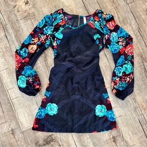 Chic women’s floral mini dress featuring a dark navy base with a vibrant teal, blue, and orange/red floral pattern. This flattering dress has long balloon sleeves with cinched wrists, a scoop neckline, and a zippered back. The tie in back adds a cute, adjustable detail for a tailored fit.