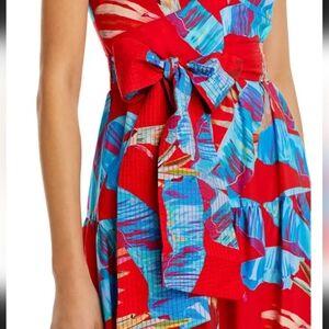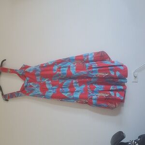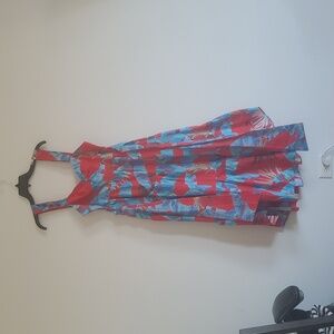 Bright and bold midi dress. Features a striking red and blue pattern. Sleeveless design with a flattering fit. Ideal for lively occasions.