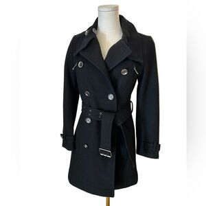 Double breasted jacket with front button closure. Fully lined. Detachable belt. Size 2.