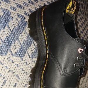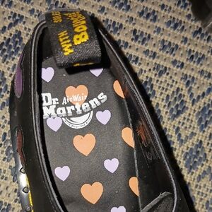 Chic Dr. Martens shoes in black with charming purple heart details. Ideal for a playful style.