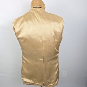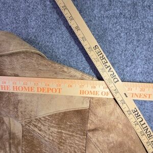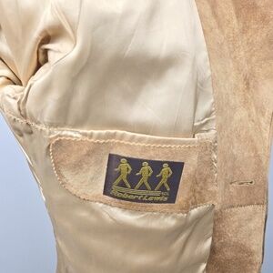 This is a vintage suede leather blazer from the brand Robert Lewis. The jacket is described as a pecan brown or tan color with a two-button closure and pockets. These types of jackets, particularly from the 1970s, were popular and featured elements of both Western and disco styles. Suede jackets are also considered a current trend for fall, with their timeless appeal and ability to pair with various outfits.