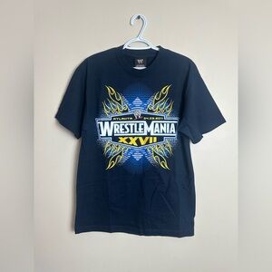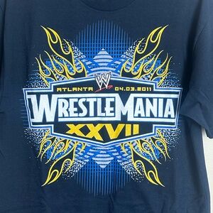 Official WWE WrestleMania XXVII graphic t-shirt in navy with yellow accents, size Men’s Medium. Made from 100% cotton, this comfortable wrestling fan tee is perfect for collectors, WWE fans, or casual streetwear.