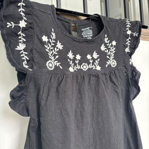 Charming black dress with delicate white embroidery. Features ruffled sleeves.