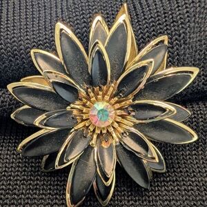 Vintage gold tone/black matte metal flower brooch. Three layers of painted matte black petals with gold tone open work petals beneath each. Gold tone leaves (3 remain, 1 leave and stem broken off , unnoticeable with wear, review final picture). The center is embellished with a large faceted Aurora borealis coated rhinestone. There are wear spots where I see metal coating loss, otherwise this large brooch is in good vintage condition. The brooch has a rollover clasp closure, straight pin. Measures approximately 2.5"H x 2.5"W costume jewelry.