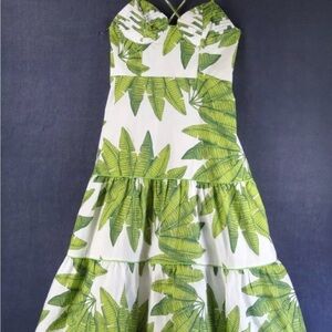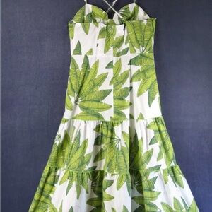 Vibrant green leaf pattern. Spaghetti straps. Elegant maxi length. Perfect for summer.