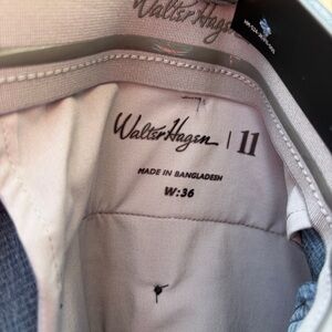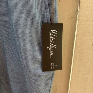Walter Hagen performance golf shorts in blue heathered fabric. Breathable stretch technical, moisture-wicking material. Subtle horizontal micro-stripe pattern , designed for performance on the course. Elastic waistband for comfort. Simple, versatile style.