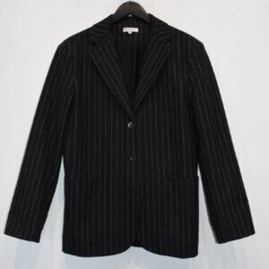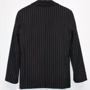 Black blazer from Horses Atelier with white striping throughout. Notched lapel collar. Three button closure. Lower front patch pockets. Single vent. Tonal satin lining. Condition: Perfect pre owned Colour: Black Stripe Labeled Size: 0 I am a size 6 and it fits me. SO fits size US 2 or 4 or small 6 Shoulder: 17.5 in Sleeve: 23.0 in Chest: 19.3 in Length: 28.0 in Composition: Cotton Lining: Rayon
