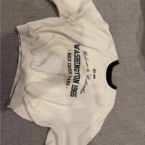 Cozy cream sweater with navy details. Features bold graphic print. Ideal for casual wear.