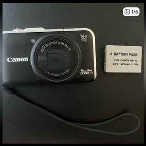 Compact Canon camera with 14x optical zoom. Includes battery pack for extended use. Ideal for capturing high-quality images. Comes from a smoke free home. Final sale