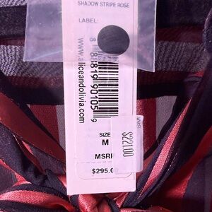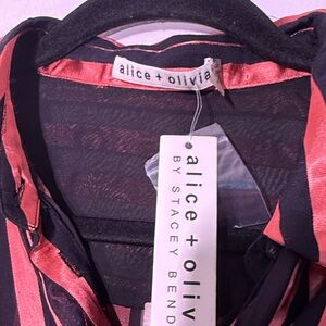 Alice & Olivia pink and black striped tie-neck silk blouse. New with tags never worn Lightweight fabric with long sleeves and a feminine bow detail at the neckline. Versatile top that pairs well with tailored pants or skirts. Featuring pink and black stripes for a bold, polished look.