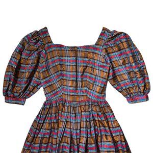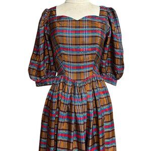 70s vintage plaid puff sleeve dress. Labelled vintage size 8, measures women’s XS; 32” chest, 24” waist, 49.5” length 100% acetate, lightweight material with a shine to it; brown with red and blue plaid pattern Oversized puff sleeves, sweetheart neckline, fitted waist, full flared skirt Buttons up at back of the top Great vintage condition with no notable flaws Brand is Finishing Touches