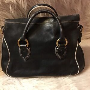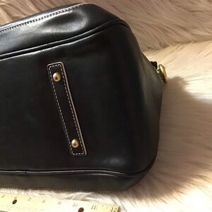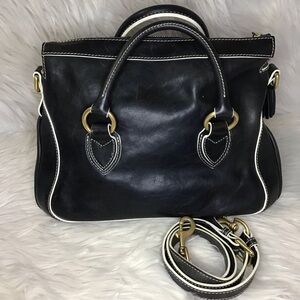 Elegant black satchel with gold hardware. Features sturdy handles and tassel detail. Perfect for any occasion.