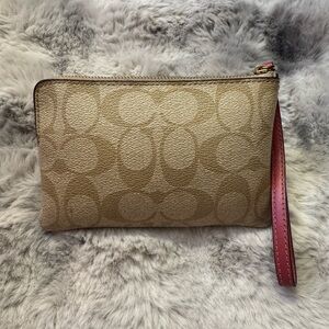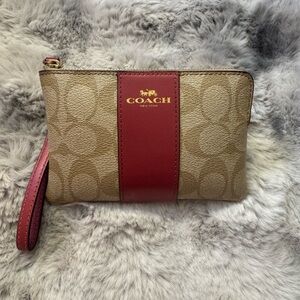 Stylish Coach wristlet with signature pattern. Features tan and red design. Perfect for any occasion.