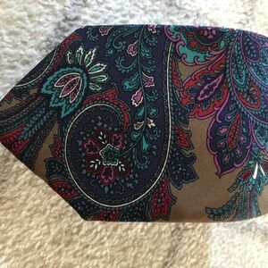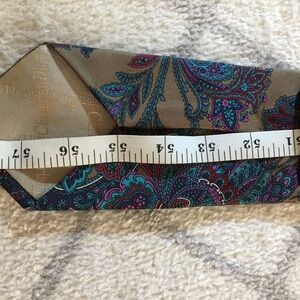 Luxurious Dior silk tie with intricate paisley design. Features rich shades of purple, teal, and tan.