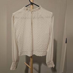Chic ivory blouse with textured pattern. Sheer long sleeves add elegance. Perfect for versatile styling.