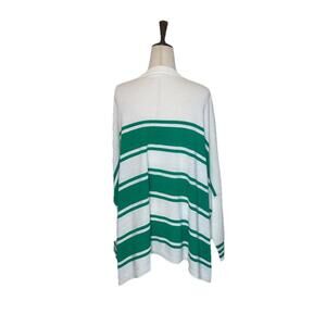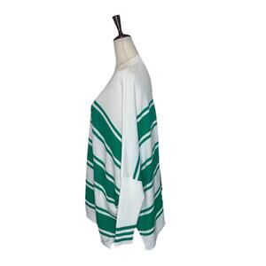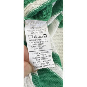 The Mersea Catalina V Neck Sweater in White Jade Stripes is a luxurious and oversized pullover sweater designed for women in one size. Made from a blend of viscose and acrylic, this sweater features a relaxed fit with a V-neckline and long dolman sleeves. The classic and beachy theme, along with the quiet luxury feel, make it perfect for travel occasions in the fall, winter, and spring seasons. Easy to care for with its machine washable fabric, this sweater is a stylish and comfortable addition to any wardrobe. Gently worn. No signs of wear. Smoke-free, pet-free home.