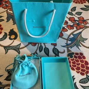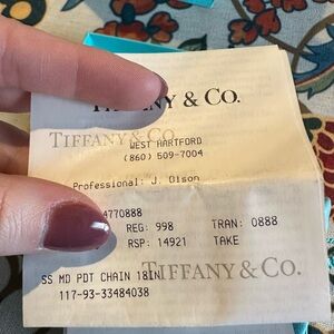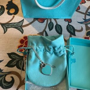 Sterling silver and Tiffany Blue heart tag pendant - on a delicate silver chain that is 18” long. Comes paired with a signature Tiffany blue drawstring pouch. Classic, simple design suitable for daily wear. New, never worn.
