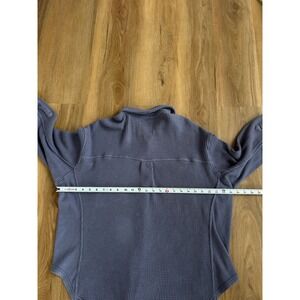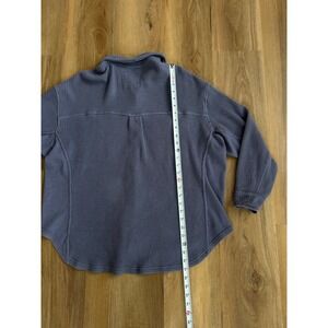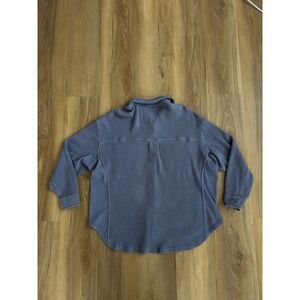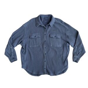 Aerie LumberJane Waffle Shirt in a navy blue coastal wash features a cozy oversized fit with a classic button-down front. This textured waffle knit top includes dual chest flap pockets and a curved hemline, making it an ideal layering piece for a relaxed, casual look. The soft cotton-blend fabric provides a comfortable, lived-in feel perfect for everyday wear. Size small