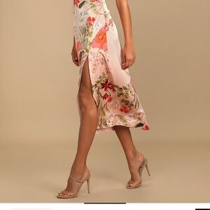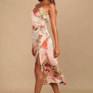 Lulu's Pink Floral Satin Midi Dress with Side Slit