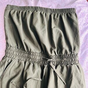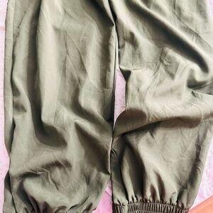 Lightweight olive green cargo joggers with a drawstring elastic waist. Features side cargo pockets and a relaxed leg. Easy, casual silhouette for everyday wear.