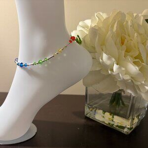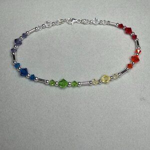 This beautiful handcrafted piece features bicone Austrian crystals in a beautiful rainbow pattern with silver accents.