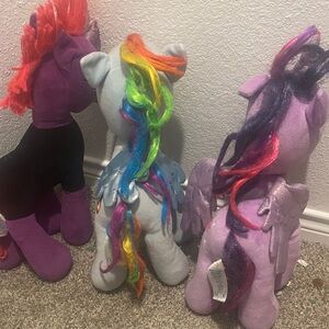 Three My Little Pony plush figures. Bright embroidered eyes and colorful manes. Soft fabric with stitched details. Great for play or display.