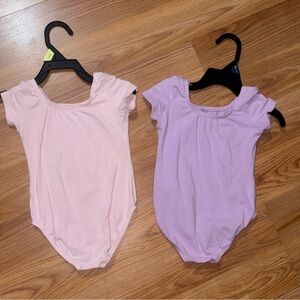 Classic short sleeve leotard in soft lilac and light pink. Scoop neckline and smooth stretch fabric. Streamlined fit for dance and class wear. Size is 2-4 years old