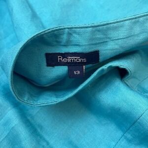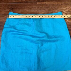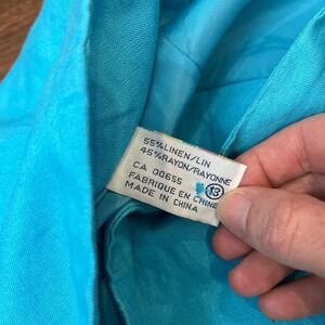 Vintage turquoise linen blend midi skirt with floral embroidered sequins trim and ruffle hem. Back zip closure. 55% linen / 45% rayon. Made in Canada. Good condition.