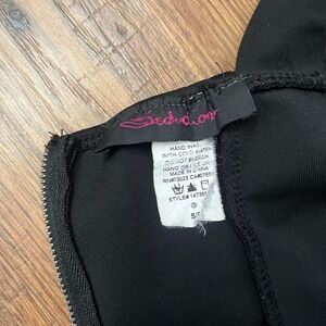 Y2K Seduction black textured crop top. Wrap-style bust, wide straps, and back zipper closure. Stretch fabric with ribbed texture. Size S.