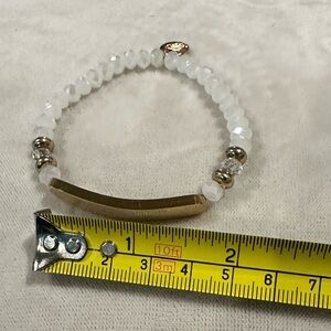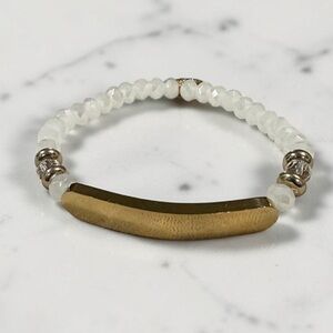 This beautiful bracelet features delicate white faceted beads paired with a sleek gold bar accent for a modern minimalist style. The neutral color palette makes it easy to pair with almost any outfit and perfect for stacking with other bracelets.