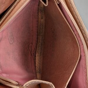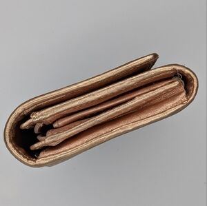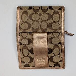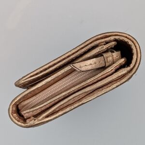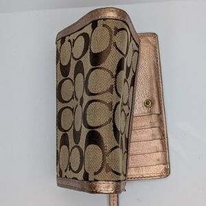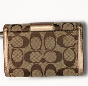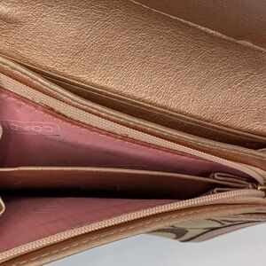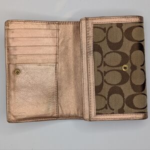 Coach Wallet Signature Canvas Trifold Khaki Brown Rose Gold Metallic Leather
