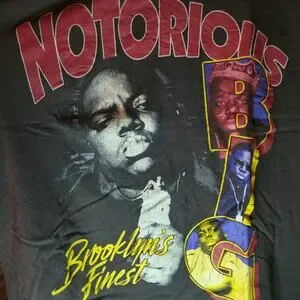 * Classic Notorious B.I.G. graphic t-shirt featuring multiple images of Biggie with “Brooklyn’s Finest” text.