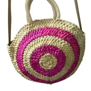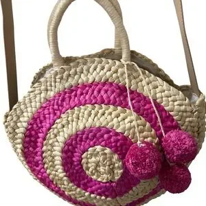 Unbranded Corn Husk Circle Beach Tote Pink Pom Poms 47 inch Leather Strap Boho