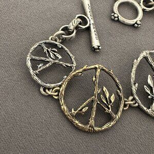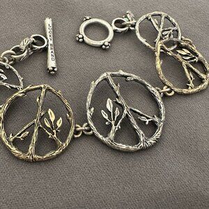 Lucky Brand Peace Symbol Bracelet Toggle Clasp 8" Mixed Metal Twigs & Leaves