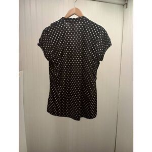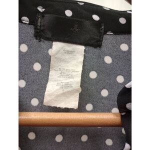 Pre-owned rvintage black white, polka dot, ruffled neck button down blouse. Soft polyester fabric, Puff sleeves v-neck. Has belt loops but no belt. Brand tag Worn and unreadable