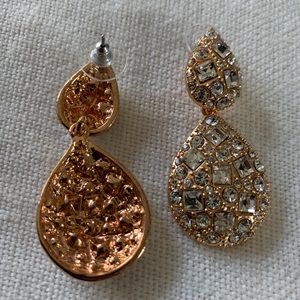 Clear baguette and round Swarovski crystal encrusted tear drop door knocker earrings in a rose gold finish. Stunning! Swarovski Crystal Gold over Brass Pierced post 1 3/8" Long
