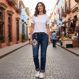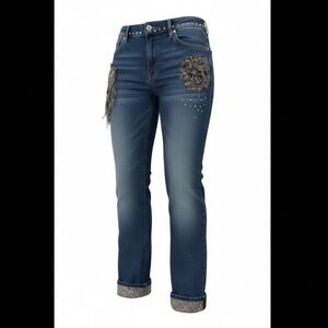 Elevate your denim collection with these eye-catching jeans, designed to make a statement. Intricate floral embroidery adorns the thigh, complemented by scattered rhinestones that catch the light with every movement. A playful tassel detail adds a touch of bohemian charm, while the cuffs reveal a vibrant paisley and leopard print lining, offering a peek of personality when cuffed. The classic blue wash and comfortable straight-leg fit make them perfect for a casual brunch or a stylish evening out.