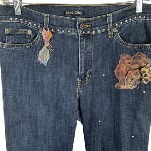 Boho Chic Embellished Denim Jeans Blue Floral Rhinestone Tassel Cuff Women's