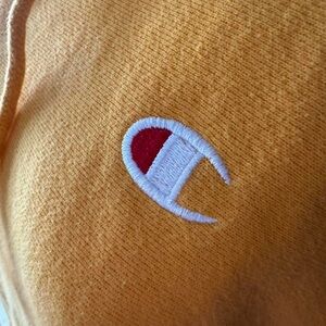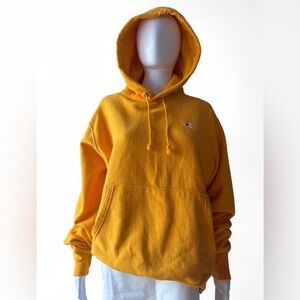 Vibrant yellow Champion hoodie with hood and drawstring. Features a front kangaroo pocket. Small embroidered Champion logo on the chest. Soft, cozy fleece material.