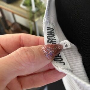 Soft ribbed tank with a subtle raw hem notch at the neckline. Cropped length for easy layering. Stretchy, form-fitting silhouette. Simple, versatile design for everyday wear. Best for C cup and under. Off white leaning grayish in my opinion. No stains or pilling.