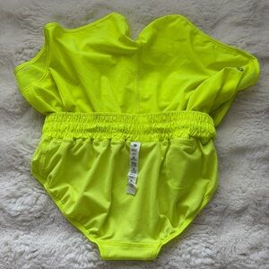 Bright highlight yellow athletic shorts.