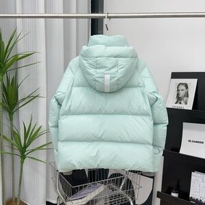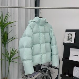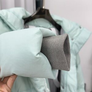Light mint puffer jacket with a cozy hood. Water-resistant shell and insulated fill for warmth. Front zip pockets and a high collar for added protection. Stylish mint color pairs easily with winter wardrobes.