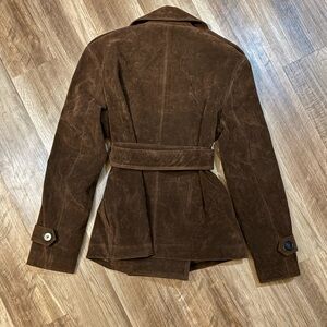 Commense dark brown suede like coat. Features a classic double-breasted design with a matching belt. Size Small. Runs oversized. NWT.