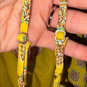 Chic top with yellow & multicolor pattern. Ideal for versatile styling. Adj straps, lined on front side.