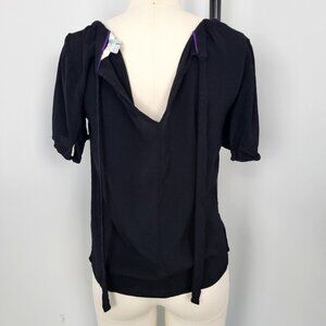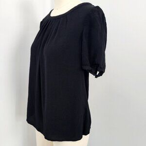 Excellent Condition. Gently preowned with no visible flaws. Lightweight and soft 100% viscose fabric. Scoop neckline with delicate pleating detail. Short puff sleeves with subtle gathers. Keyhole back with tie closure.