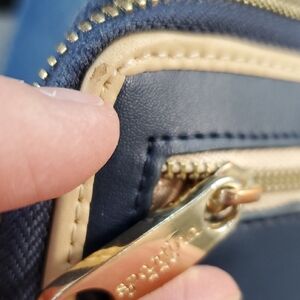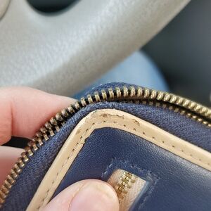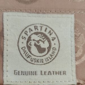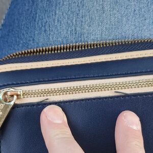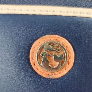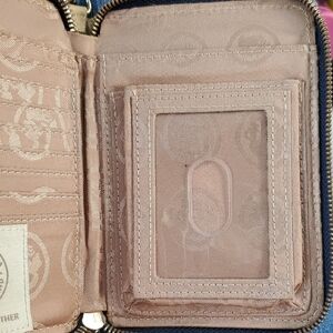 Stylish and compact, this Spartina wristlet wallet features a striking navy and yellow (lime green?) design. Inside is like new. 8 credit card slots, 1 bill area, 2 pockets for more cards and a drivers license clear pocket. Detachable wristlet strap. Perfect for organizing your Wessentials with elegance. Some wear on 2 corners and back at zipper so please see pictures. Approx 5.75"x4.25"x .75"